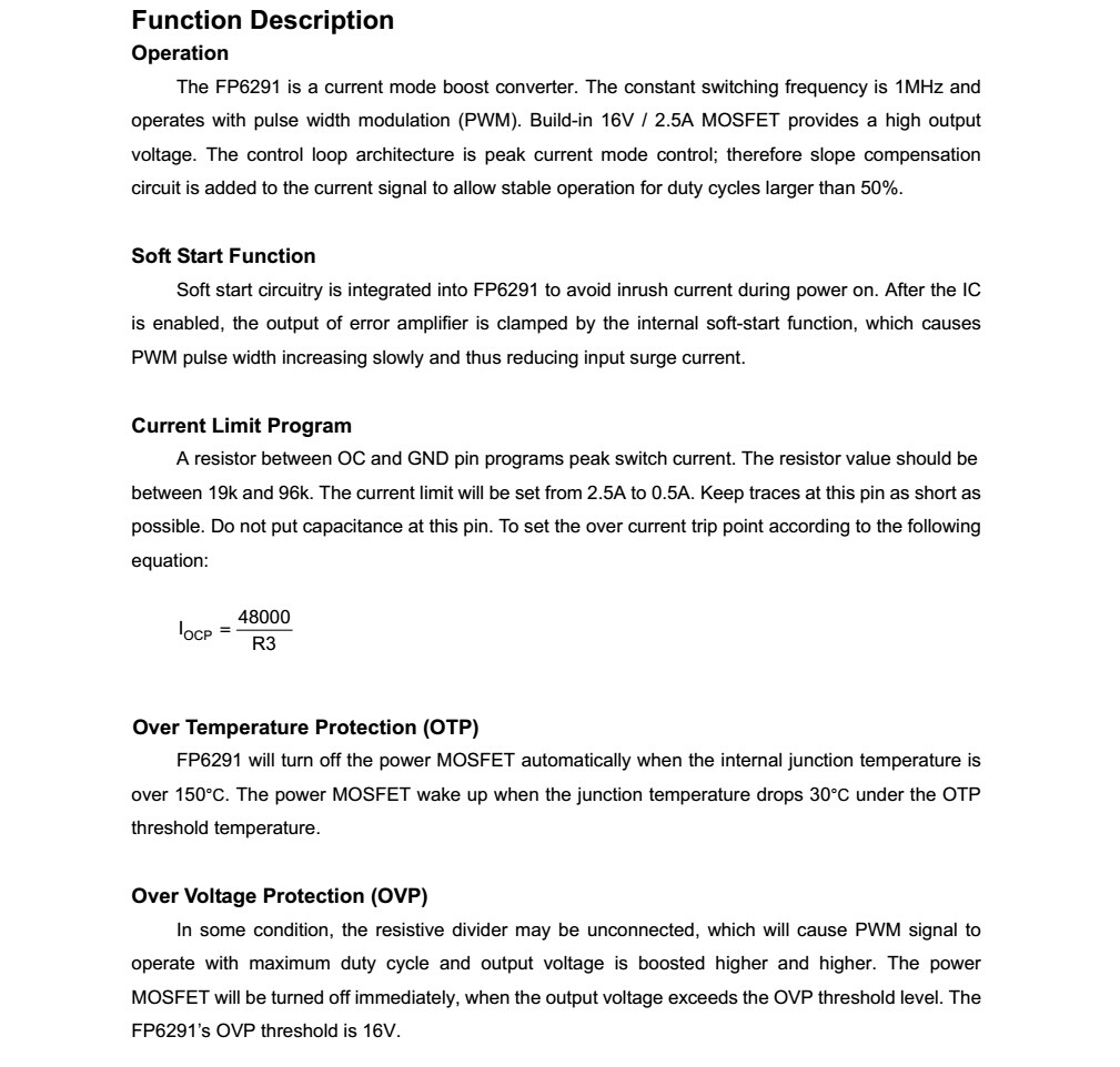 FP6291內置過溫保護,關斷保護,欠壓保護,過流保護,并可以外接電阻調整最大過流保護值(0.5~2.5A)。