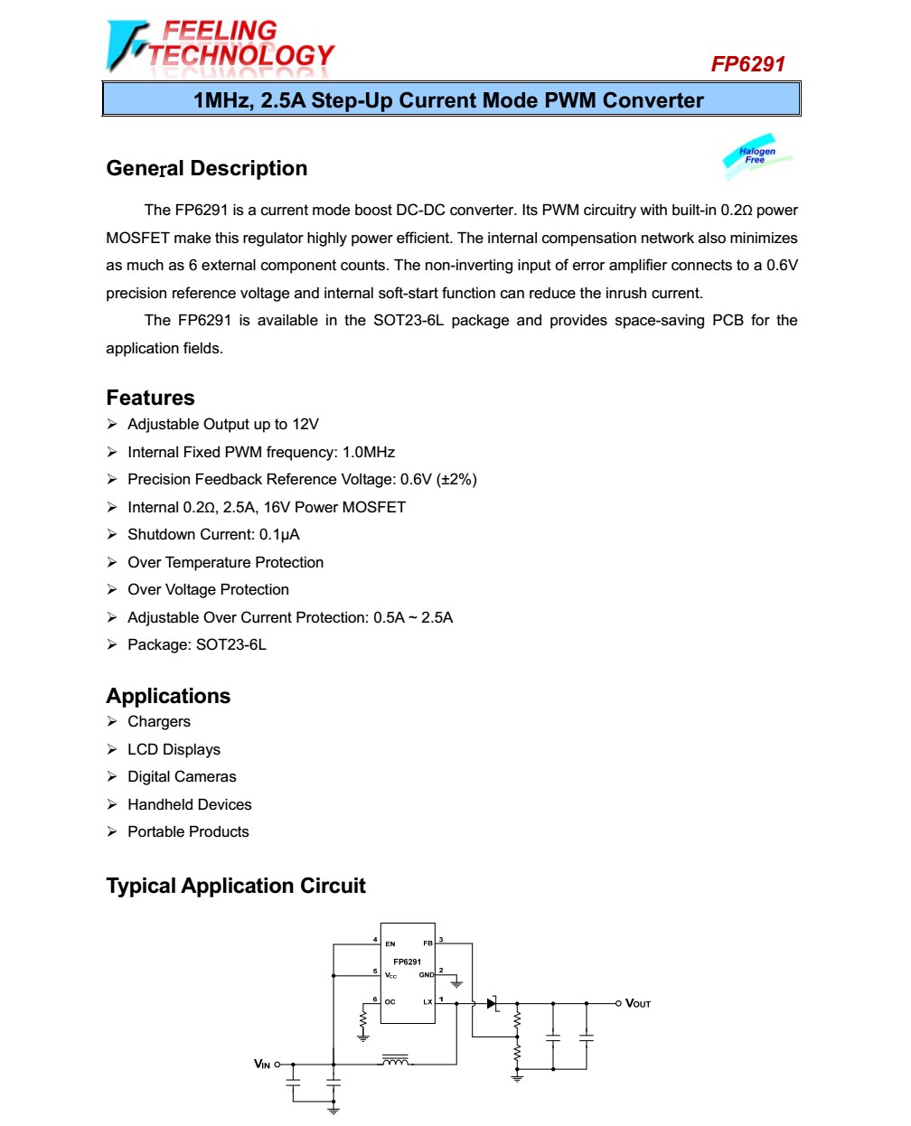 FP6291封裝為SOT23-6,工作頻率為1MHZ,可以搭配3.3uh小型貼片電感,減少成品體積。