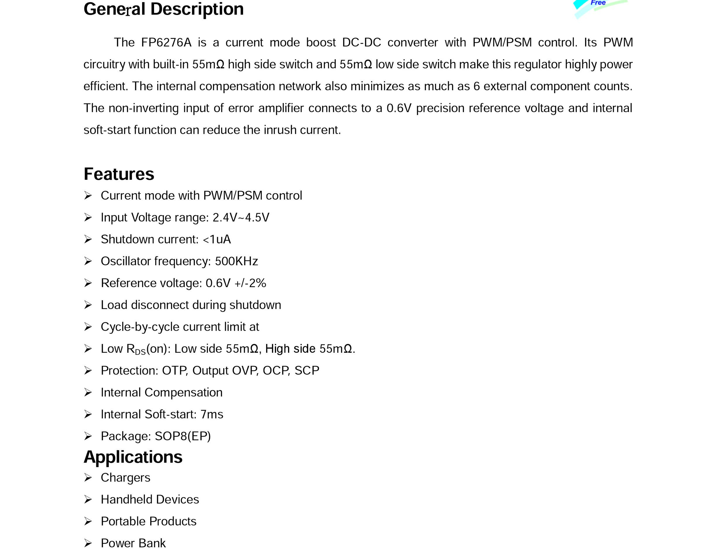 FP6276A是臺灣遠翔科技生產; 輸入電壓:2.4V至4.5V 輸出電壓:最大5.3V 輸出電流:2.1A,或者2.1A以下。 |