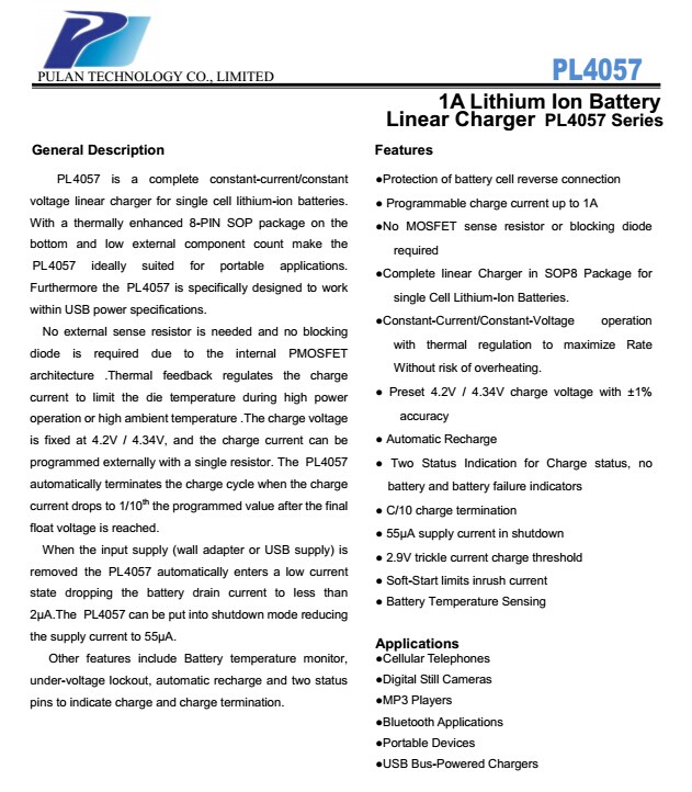 4.35V鋰電池充電IC-PL4057,充電電流1A,雙指示燈,可以直接代替4056;