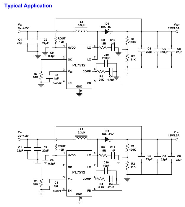 PL7512適用于3.7V升壓轉9V1.5A實際應用,PL7512適用于3.7V升壓轉12V1A實際應用。
