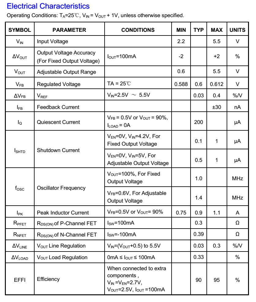 輸入電源范圍:2.2V-5.5V 外圍簡單,同步整流降壓,高效率,低功耗,短路保護,EN使能控制腳。