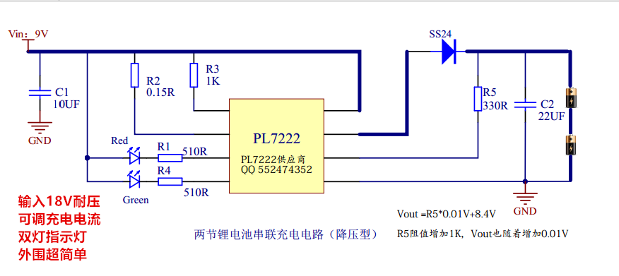 雙節鋰電池串聯充電IC-PL7222,降壓型線性充電,充電電流1A,輸入電壓9V以上,外圍簡單,帶雙指示燈。