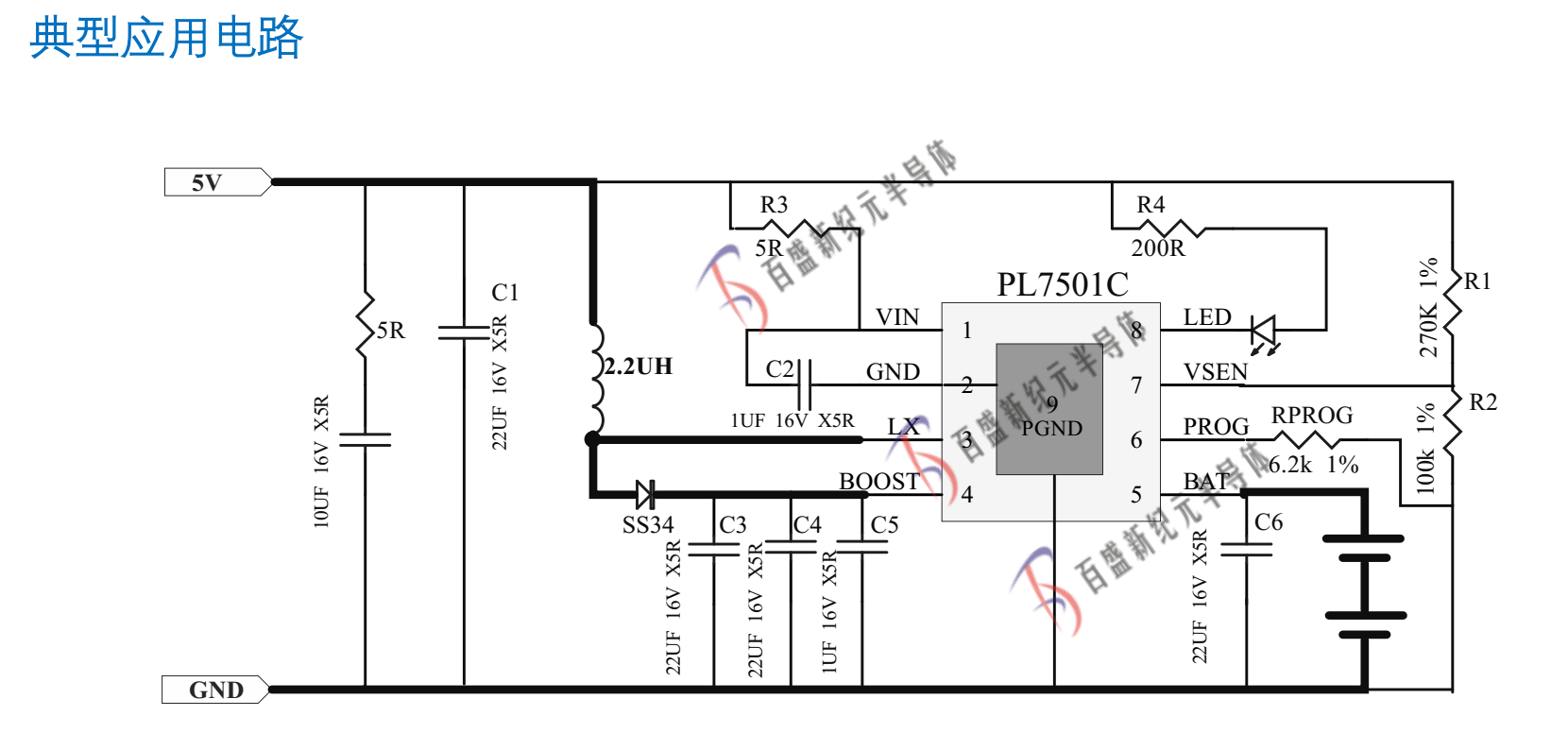 PL7501可應用于5V輸入,給雙節鋰電池充電電路。