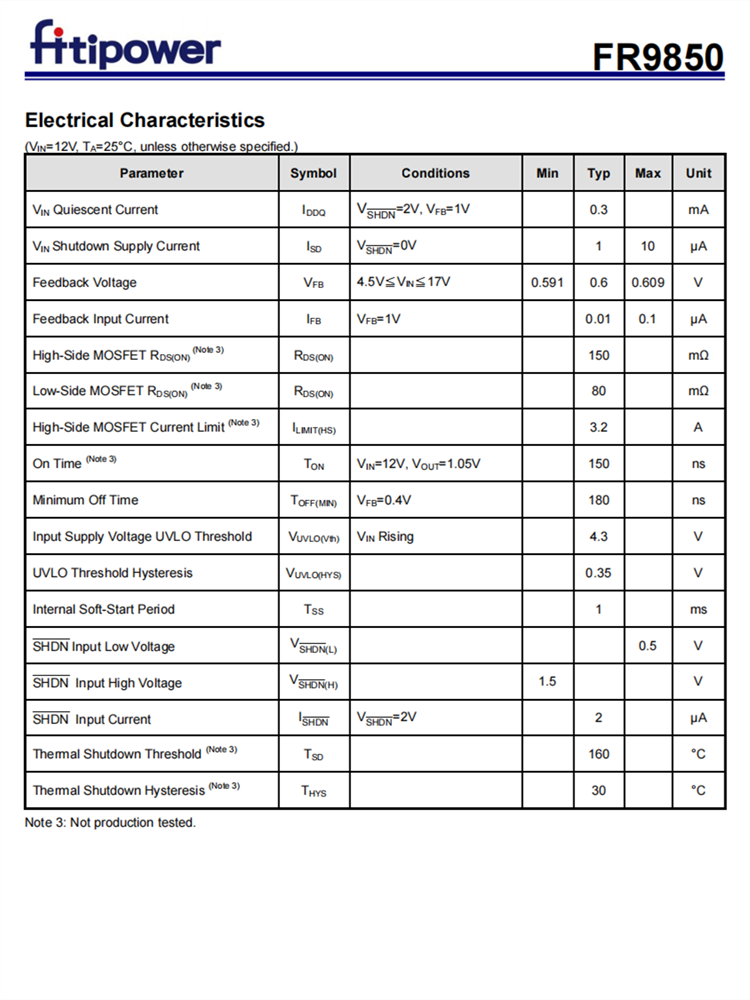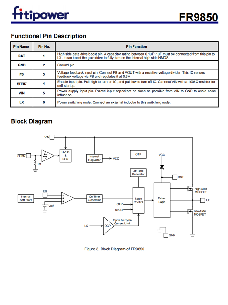 FR9850故障保護包括逐循環(huán)電流限制、短路保護、UVLO和熱停機。軟啟動功能防止開啟時涌電流。FR9850使用快速常數(shù)的時間控制,提供快速的瞬態(tài)響應,抗噪聲性和各種非常低的ESR輸出電容器,以確保性能穩(wěn)定。