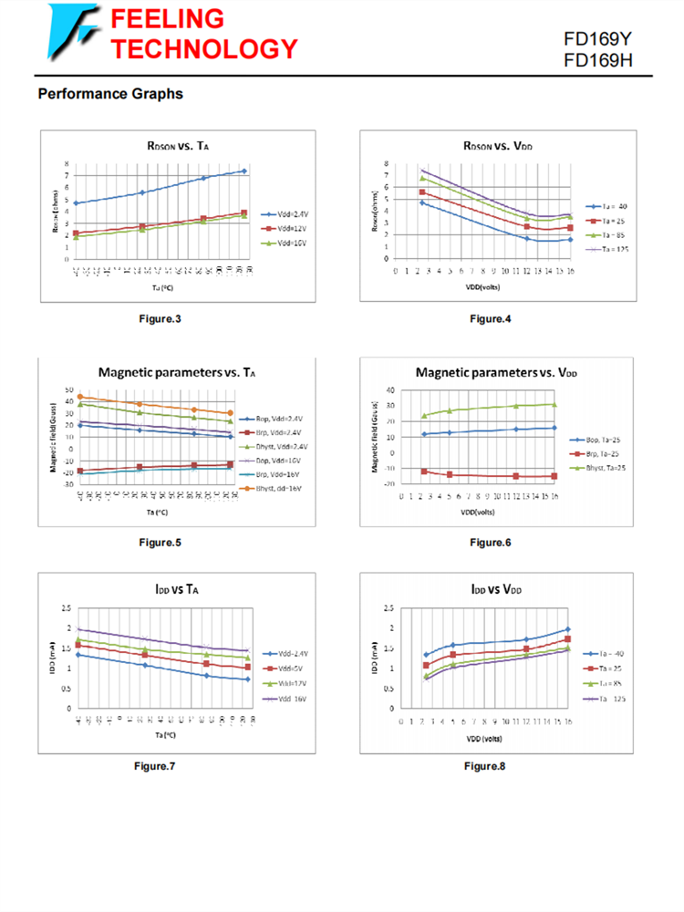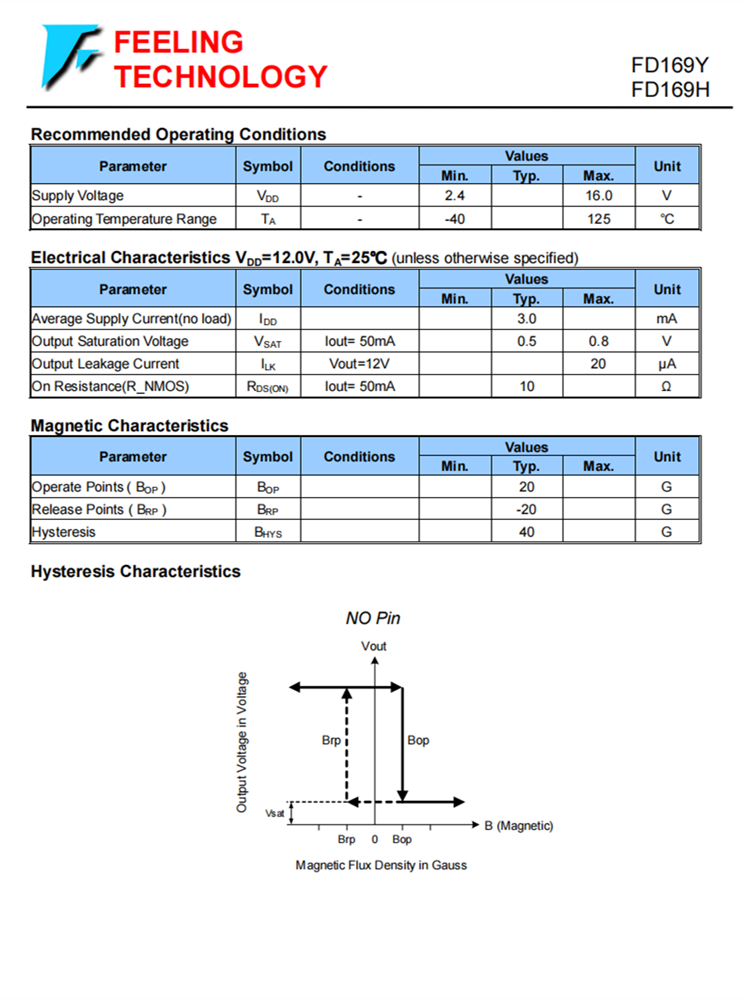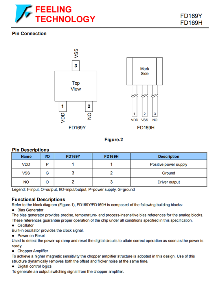 FD169Y/FD169H是一個具有鎖存數字輸出的霍爾傳感器。它適用于無刷直流電機的電子換向應用。FD169Y/FD169H使用斬波器放大器進行磁信號放大,可以實現低偏移量,從而實現精確的磁開關閾值。