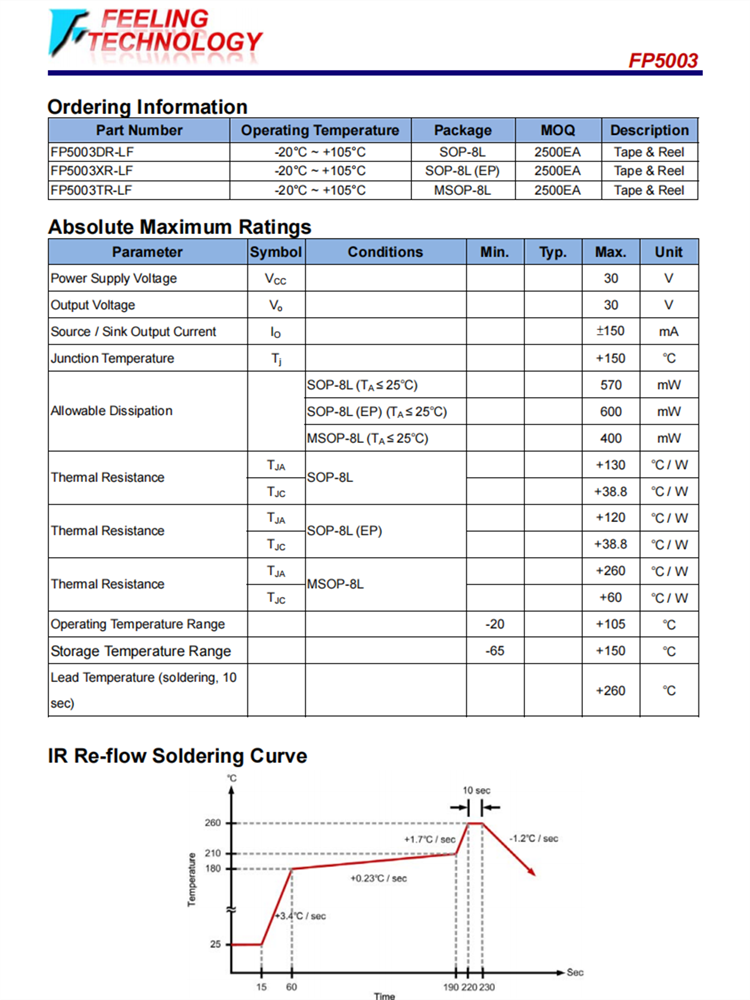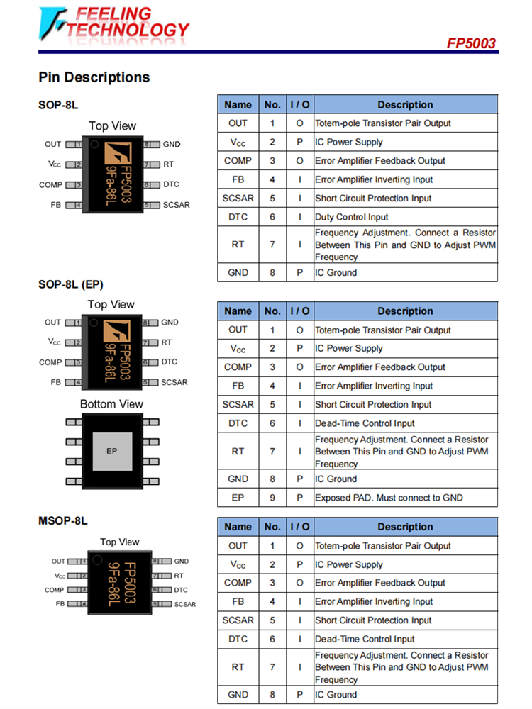 FP5003是一種高性能的單片集成電路,包括可調(diào)頻率振蕩器、用于脈寬調(diào)制(PWM)控制的誤差放大器、1.0V精密電壓參考、欠壓鎖定電路(UVLO)、可變脈沖占空比控制(DTC)電路和用于短路停機(jī)保護(hù)(SCSAR)的可編程自動(dòng)重啟定時(shí)器。內(nèi)置圖騰柱極管對(duì)直接驅(qū)動(dòng)MOS。使用一些外部組件設(shè)計(jì)一個(gè)DC-DC轉(zhuǎn)換器非常容易的。