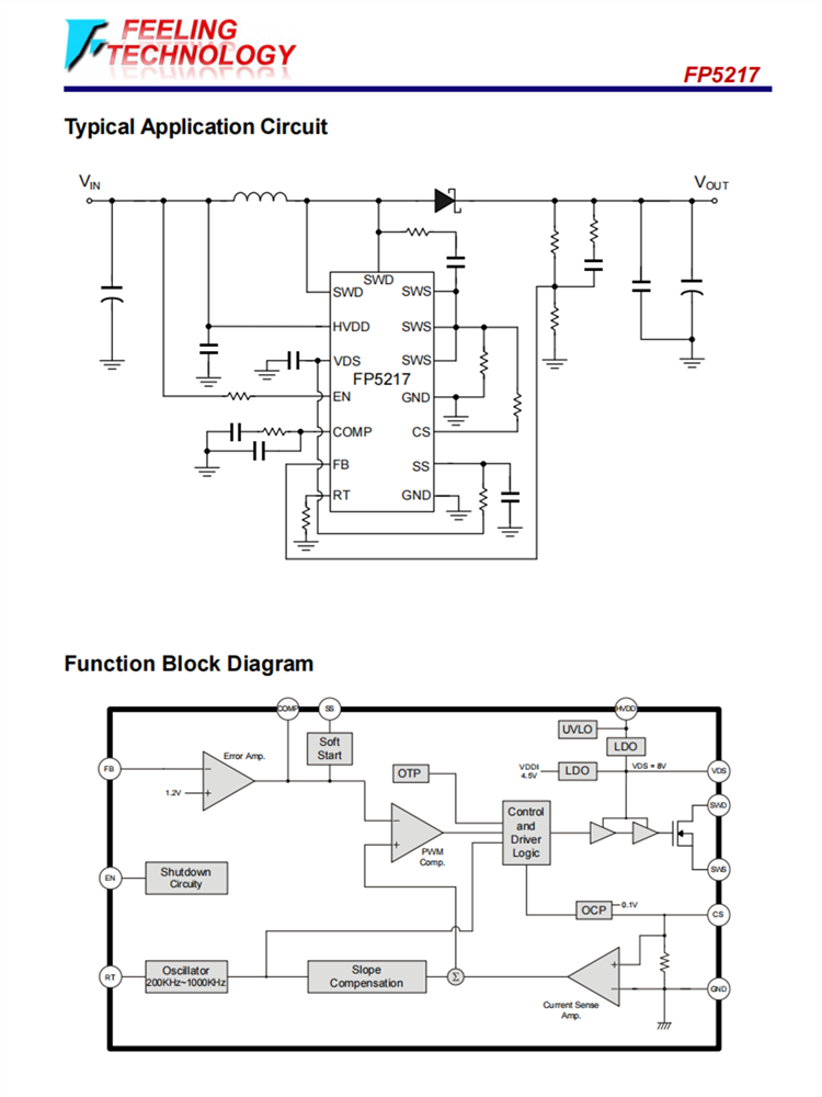 FP5217是用于廣泛工作電壓應用的升壓拓撲開關調節器。其內置的15mΩ功率MOSFET使該調節器具有高度的功率高效。誤差放大器的非反相輸入連接到一個1.2V的精度參考電壓。它具有由外部電阻器設置的可編程開關頻率,并且可編程電感器的峰值電流極限將電阻器從CS連接到GND。電流模式控制和外部補償網絡使系統穩定簡單靈活。