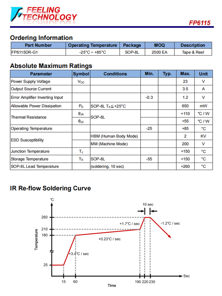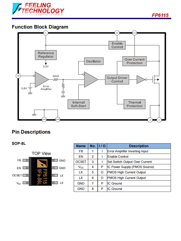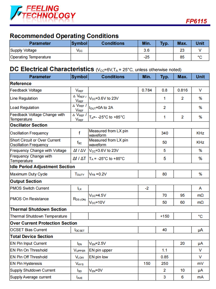 FP6115是一種用于廣泛工作電壓應用領域的降壓開關調節器。FP6115包括一個高電流P-MOSFET,一個用于將輸出電壓與反饋放大器進行比較的高精度參考(0.8V),一個內部軟啟動定時器和死時間控制器。該振蕩器用于控制最大占空比和PWM頻率。
