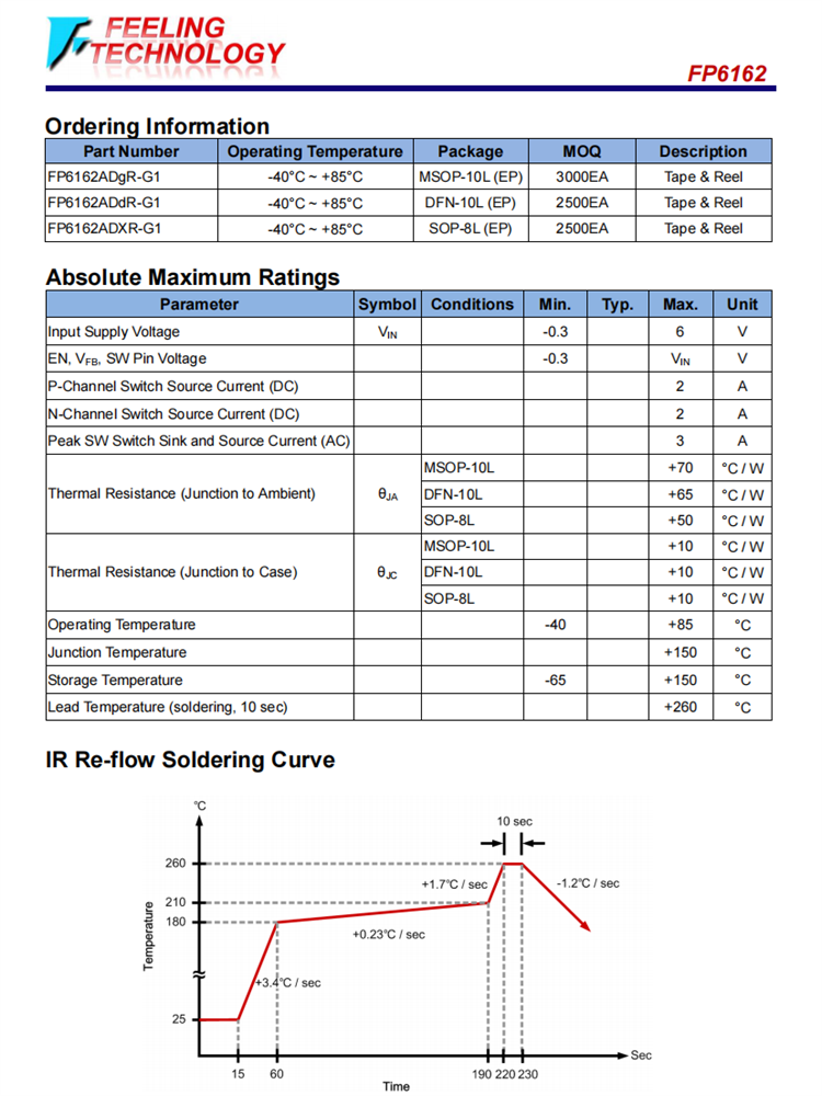 FP6162是一種高效電流模式同步降壓PWM DC-直流調(diào)節(jié)器。內(nèi)部產(chǎn)生的0.6V精度反饋參考電壓被設計用于低輸出電壓。低RDS(ON)同步開關可顯著降低導電損耗。為了延長便攜式應用程序的電池壽命,低損耗操作支持100%的占空比。關閉模式還有助于節(jié)省當前的消耗。FP6162采用MSOP-10L、DFN-10L和SOP-8L,以減少PCB空間。