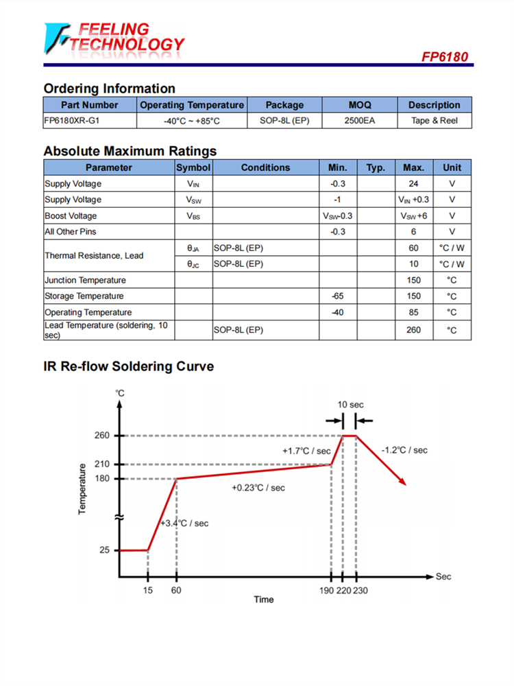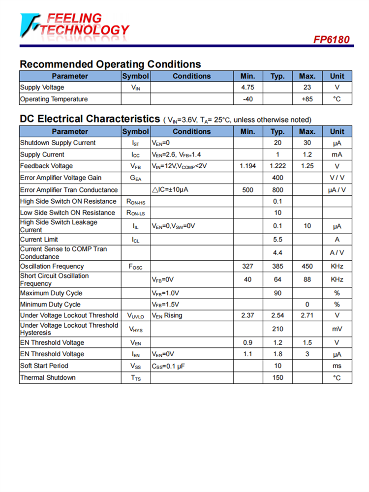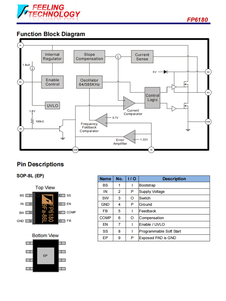 FP6180是一個內置內部功率MOSFET。它在廣泛的輸入電源范圍內實現3A連續輸出電流,具有良好的負載和線路調節。電流模式的操作提供了快速的瞬態響應和簡化的回路穩定。該裝置包括逐循環限流和熱停機保護。可調軟啟動減少了通電時輸入源的壓力。調節器在關閉模式下只消耗20μA的電源電流。FP6180需要最少數量的現成的外部組件來完成一個3A降壓調節器解決方案。