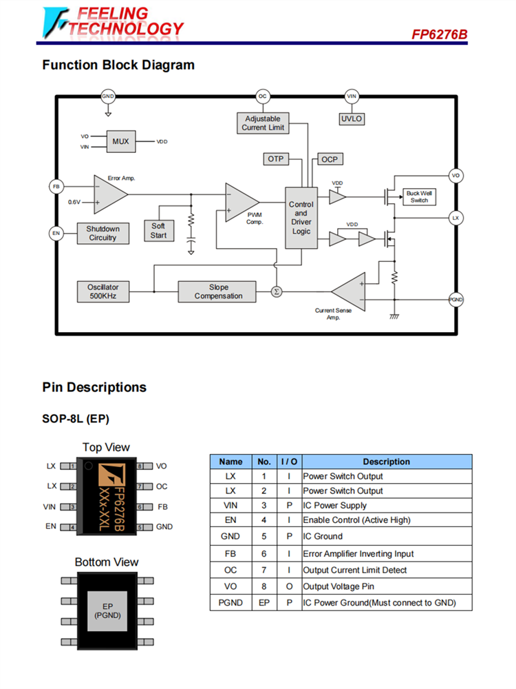 FP6276B 500 kHz 5A高效同步PWM增壓轉換器芯片