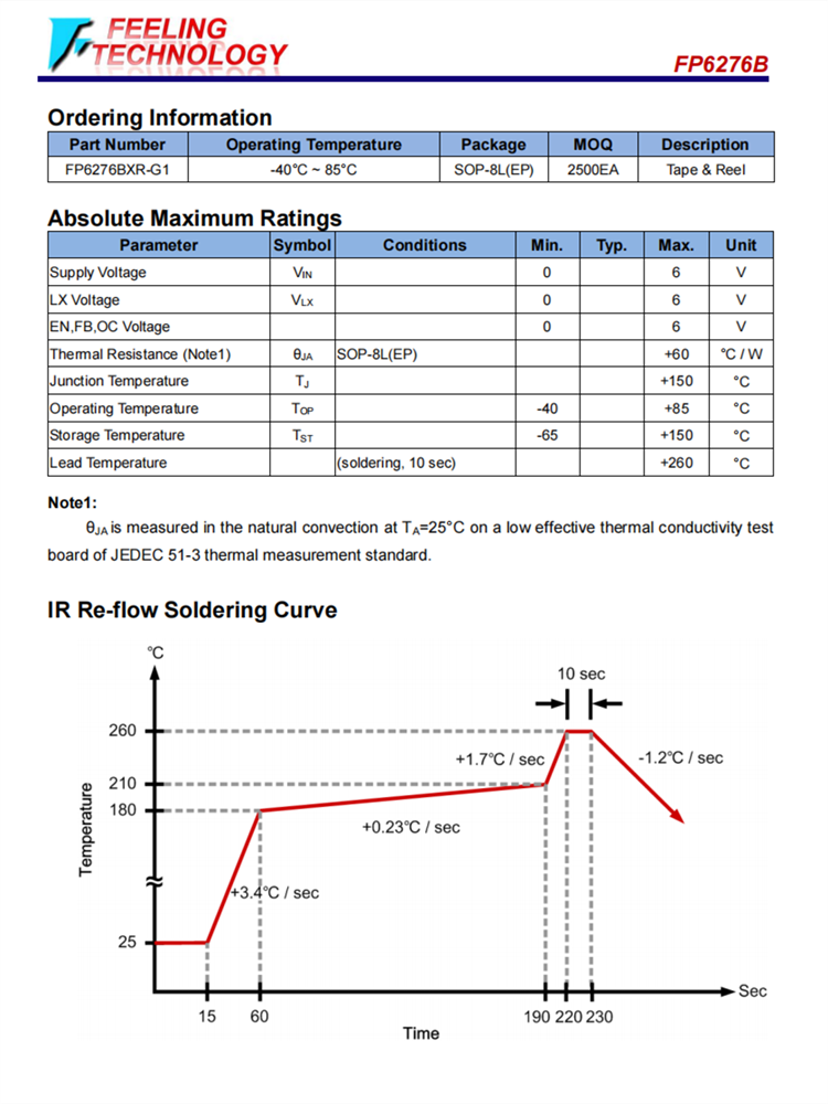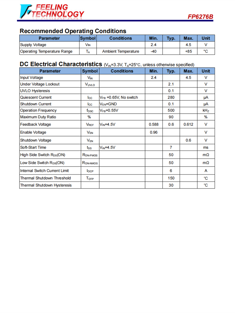 FP6276B是一個具有PWM/PSM控制的電流模式增壓直流-直流轉換器。它的PWM電路內置50mΩ高側開關和50mΩ低側開關使該調節器高高效。內部補償網絡還將外部組件計數最小化到只有6個。一個內部的0.6V電壓被連接到誤差放大器的非反相輸入作為精度參考電壓。內置軟啟動功能可以減少涌電流。
