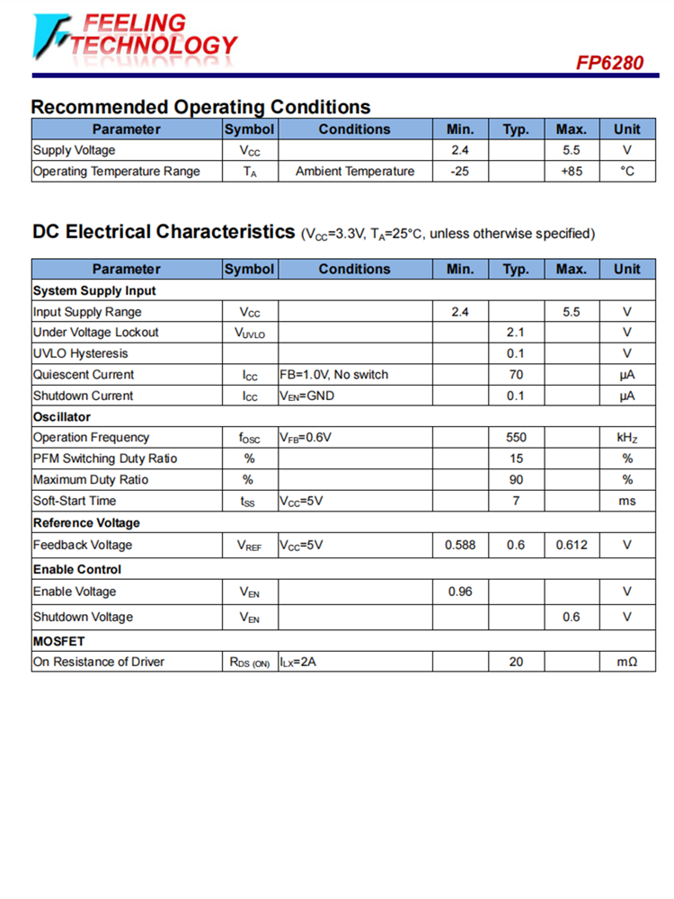FP6280是一種用于廣泛工作電壓應用的升壓拓撲開關調節器。其內置的20 mΩ功率MOSFET使該調節器的功率高效。內部補償網絡使外部組件計數最小化,并且誤差放大器的非反相輸入連接到一個0.6V的精度參考電壓。FP6280具有內部軟啟動和可編程的過電流保護設置的外部電阻。