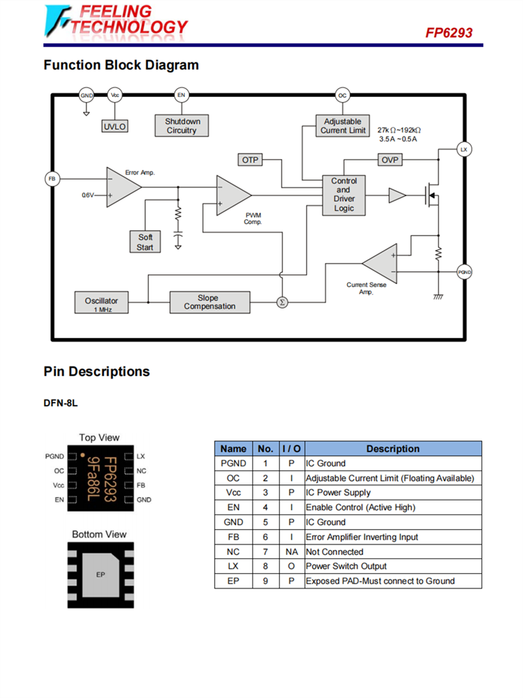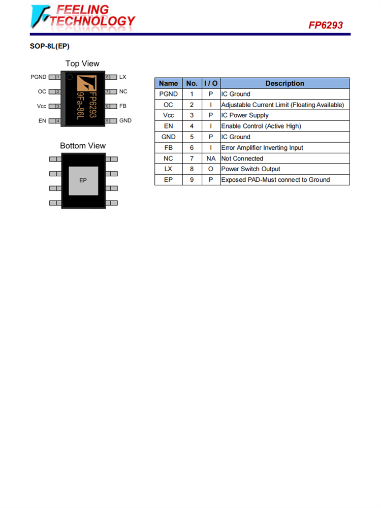 FP6293可在DFN-8L/SOP-8L(EP)軟件包中提供,并為應用程序領域提供了節省空間的PCB。