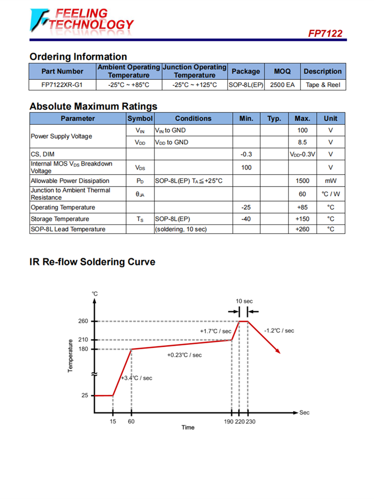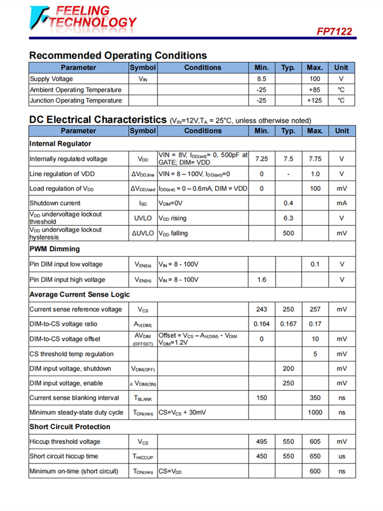 FP7122是在恒定關閉時間模式下工作的平均電流模式控制LED驅動器IC。FP7122不產生峰值到平均的誤差,因此大大提高了LED電流的精度、線路和負載調節,而不需要任何回路補償或高側電流傳感。輸出的LED電流精度為±3%。