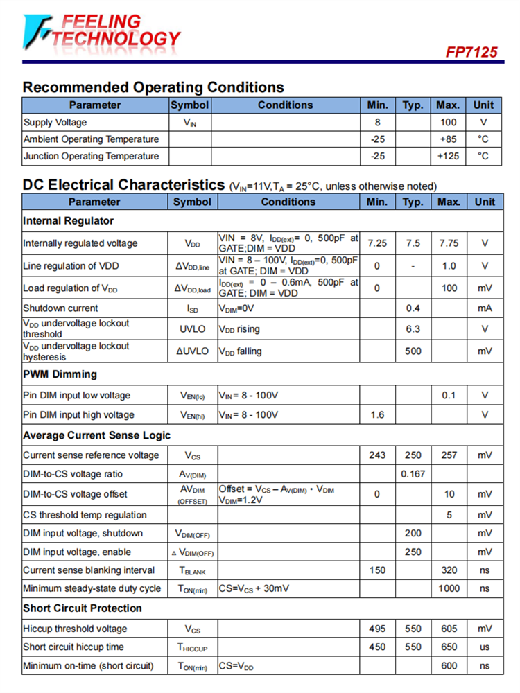 FP7125可以從8.0 - 100V電源供電。提供PWM &線性調光輸入,接受外部控制TTL兼容信號。輸出電流可以通過內部250 mV參考值進行編程。