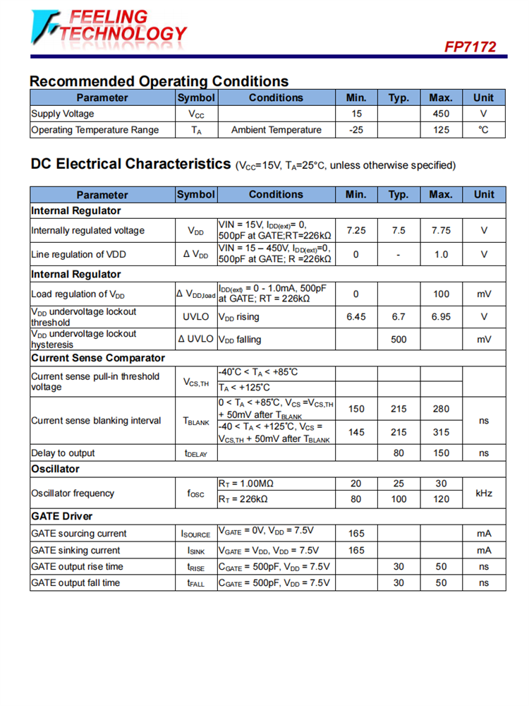 FP7172是一個開環,電流模式,控制LED驅動器IC。FP7172可以被編程為在一個恒定的頻率或恒定的關閉時間模式下工作。它包括一個15 - 450V的線性調節器,允許它工作在一個廣泛的輸入電壓范圍,而不需要一個外部低壓電源。FP7172非常適合用于1億美元的LED驅動器。由于FP7172工作在開環電流模式控制下,控制器實現了良好的輸出電流調節。