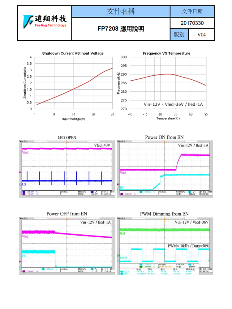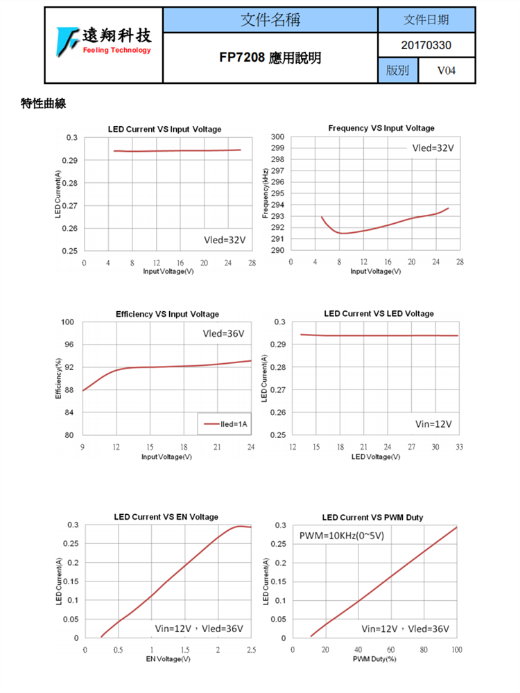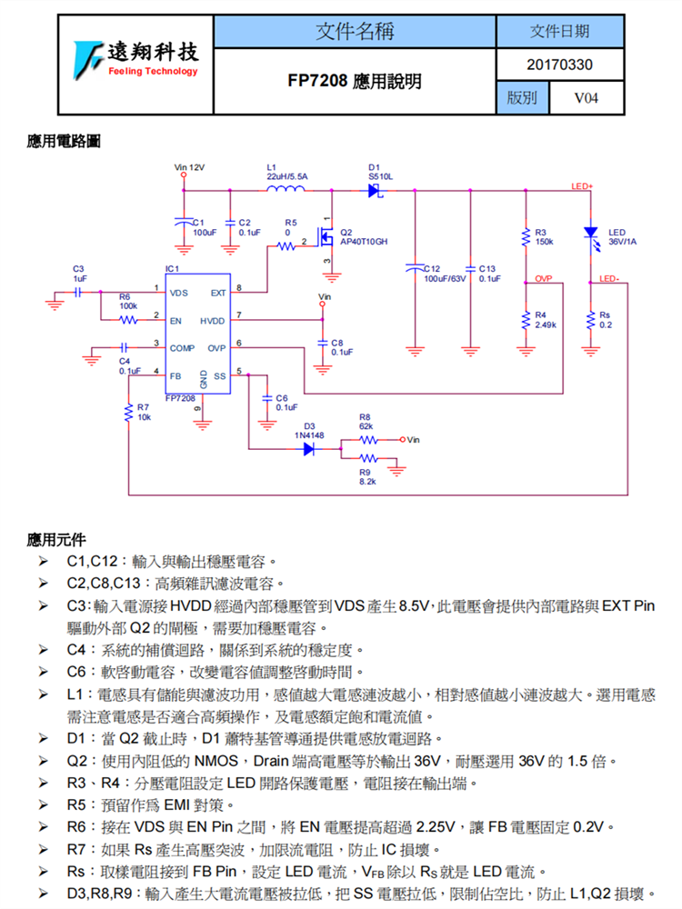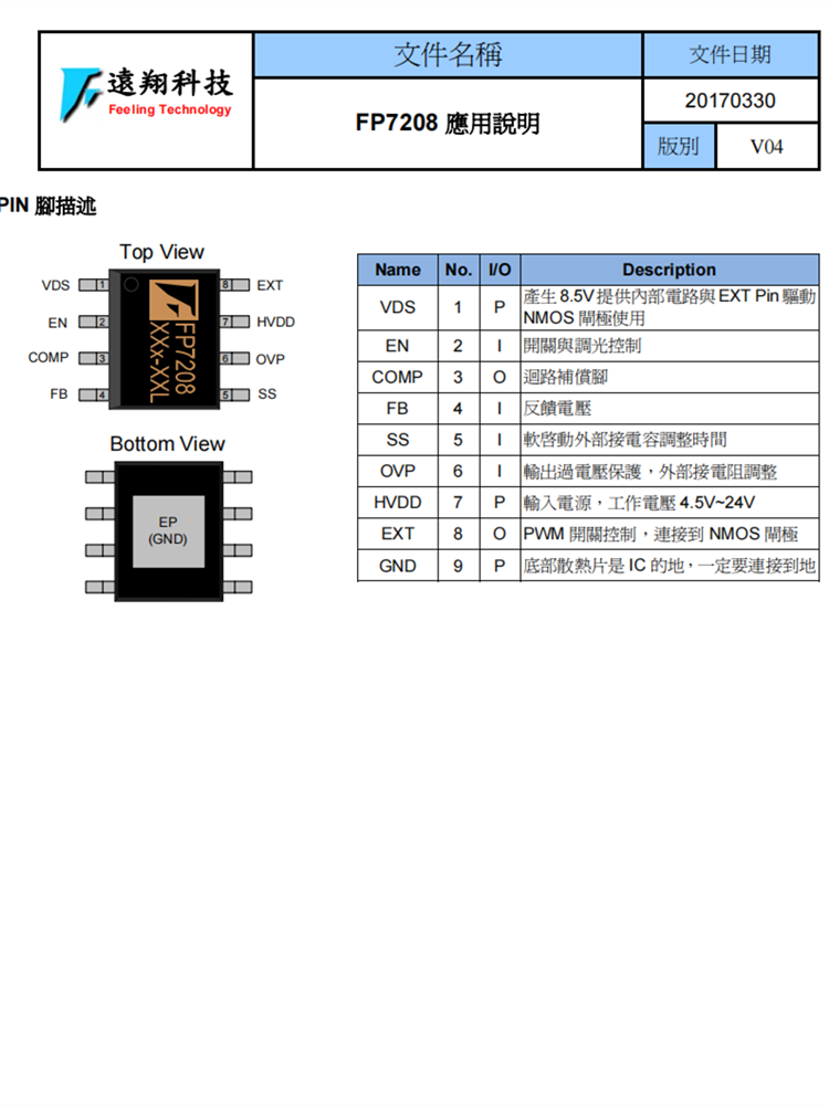 FP7208 是一顆非同步升壓 LED 驅動 IC,控制外部開關 NMOS,輸入低啟動電壓 2.5V,工作電壓 4.5V,VFB反饋電壓 0.2V,反饋電壓低,取樣電阻功率損耗也降低,整體轉換效率提升。軟啟動時間透過外部電容調整,LED 開路保護透過外部電阻調整;調光控制 EN Pin,EN 內部有濾波器,可以實現線性興數位調光,內置過熱保護功能。