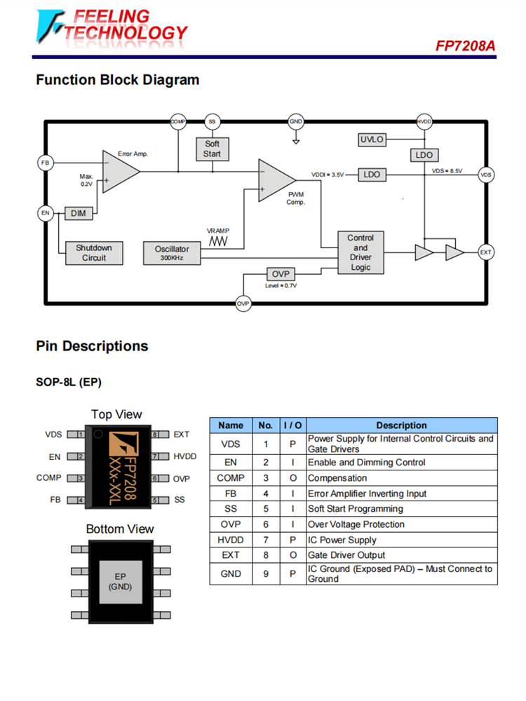FP7208A是針對LED驅動器的增壓拓撲開關調節器。它提供了內置的門驅動銷,用于驅動外部N-MOSFET。誤差放大器的非反相輸入端連接到一個0.2V的參考電壓。它具有由外部電容器設置的可編程的軟啟動時間,以及由外部電阻設置的過電壓保護。LED電流可以通過一個連接到EN針腳的外部信號來調整。EN引腳接受直流電壓或PWM信號。PWM信號濾波器組件包含在芯片中。