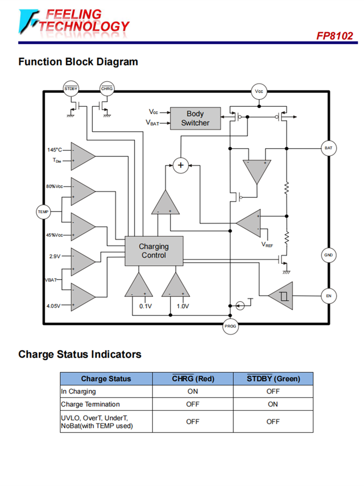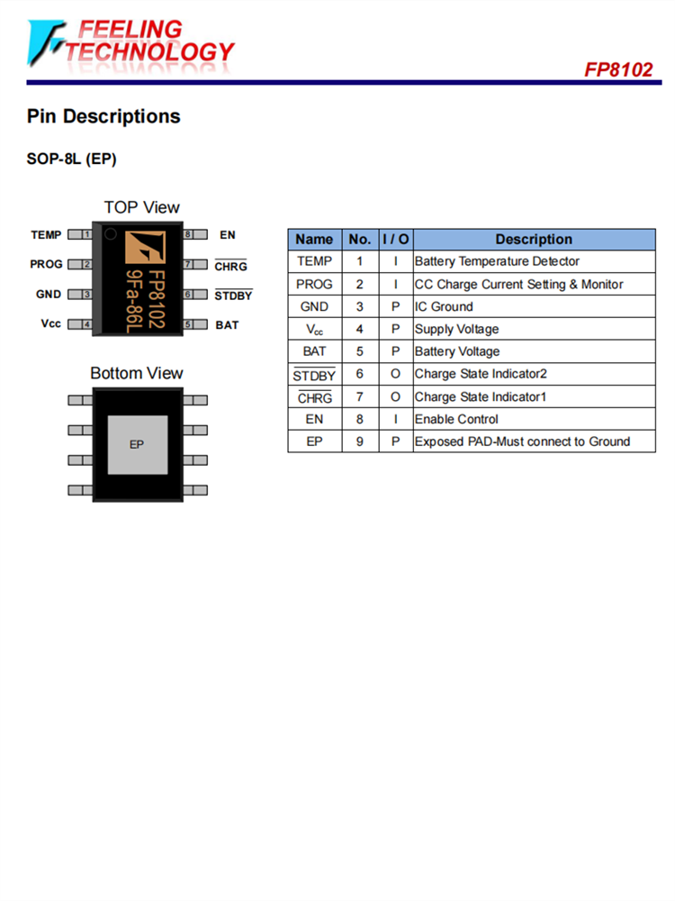 FP8102是一個獨立的線性鋰離子電池充電器,與暴露墊SOP8包。由于FP8102的外部組件很少,因此它非常適合用于廣泛的便攜式應用程序。充電電流可以由外部電阻器進行編程。在待機模式下,電源電流將減少到55uA左右。其他功能還包括UVLO、自動充電、充電狀態(tài)指示器和熱調(diào)節(jié)。