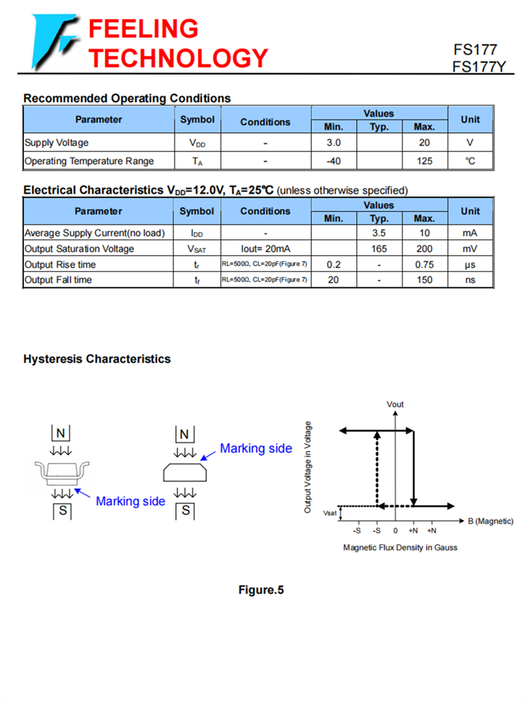 FS177/FS177Y是一個(gè)集成的霍爾效應(yīng)鎖存?zhèn)鞲衅鳎O(shè)計(jì)用于無刷直流電機(jī)應(yīng)用的電子換向。該設(shè)備包括一個(gè)用于磁傳感的片上霍爾電壓發(fā)生器,一個(gè)放大霍爾電壓的比較器,以及一個(gè)用于為噪聲抑制提供開關(guān)滯后的施密特觸發(fā)器,以及開集電極輸出。一個(gè)內(nèi)部帶隙調(diào)節(jié)器用于為內(nèi)部電路提供溫度補(bǔ)償?shù)碾娫措妷海⒃试S一個(gè)廣泛的工作電源范圍。