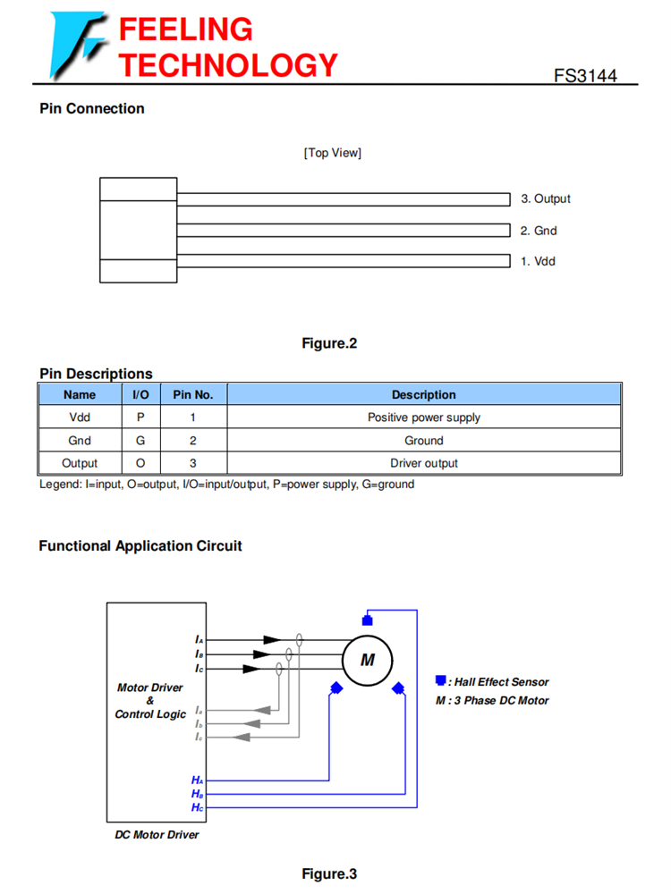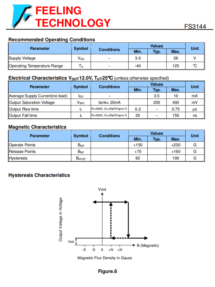 FS3144是一個集成的霍爾效應鎖存傳感器,設計用于無刷直流電機的電子換相應用。該設備包括一個用于磁傳感的片上霍爾電壓發生器,一個放大霍爾電壓的比較器,以及一個用于為噪聲抑制提供開關滯后的施密特觸發器,以及開集電極輸出。一個內部帶隙調節器用于為內部電路提供溫度補償的電源電壓,并允許一個廣泛的工作電源范圍。