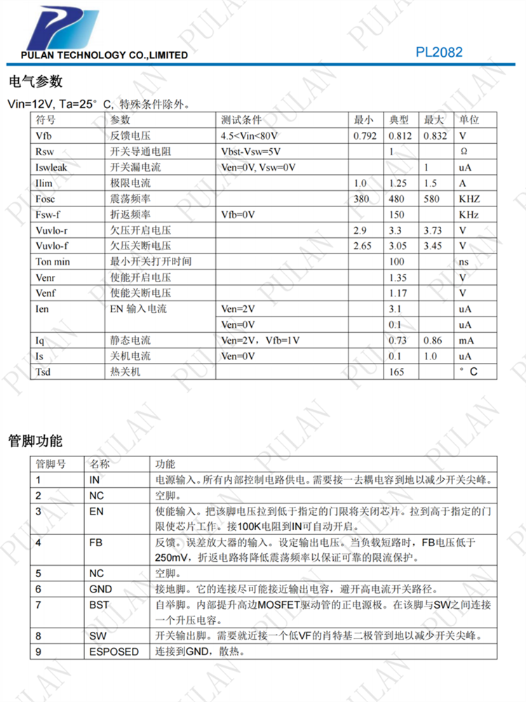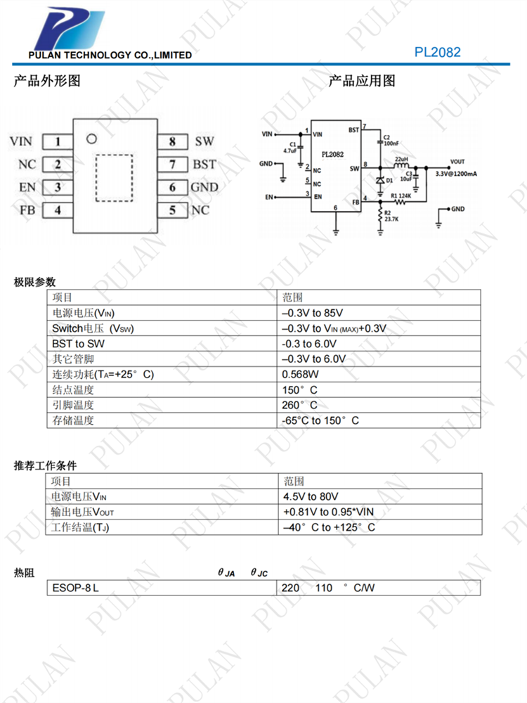 PL2082是一款內部集成有功率MOSFET管的降壓型開關穩壓器。以電流模式控制方式達到快速環路響應并提高環路的穩定性。寬范圍輸入電壓(4.5 V至80V)提供最大1.5A電流的高效率輸出,可在移動環境輸入的條件下實現各種降壓型電源變換的應用。0.1uA的關機靜態電流適合電池供電場合的應用。故障狀態的保護包括逐周期電流限流保護和熱關機保護。電路外圍簡單,封裝采用ESOP8。