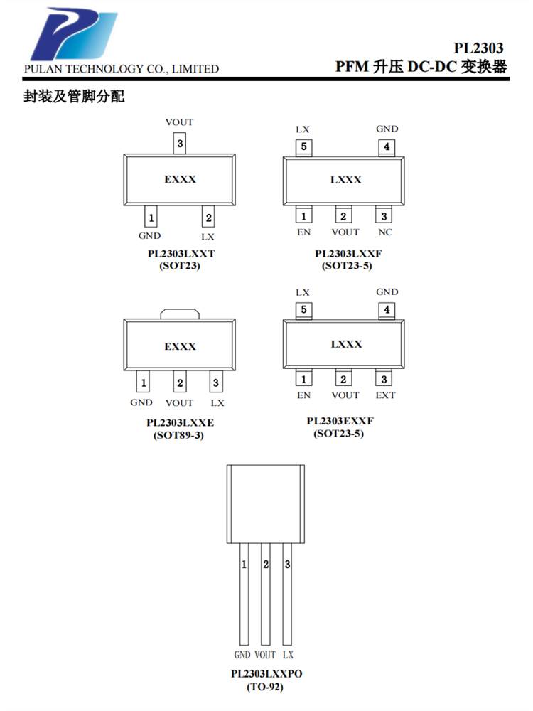 PL2303系列產品總共有四種封裝形式:SOT23、SOT23-5、SOT89-3 和 TO-92。其中,SOT23-5 封裝內置了 EN 使能端,可控制變換器的工作狀態,當 EN 使能端輸入為低電平時,芯片處于關斷省電狀態,功耗降至最小。