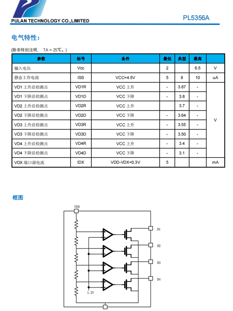 PL5356A 內(nèi)置比較器和反饋回路,實(shí)現(xiàn) 4 個(gè)電壓點(diǎn)的檢測。通過內(nèi)部修調(diào)技術(shù),可以保證電壓檢測精度達(dá)到±1%。輸出采用 OPENDRAIN 結(jié)構(gòu),便于客戶使用 IO 口或者 LED指示。