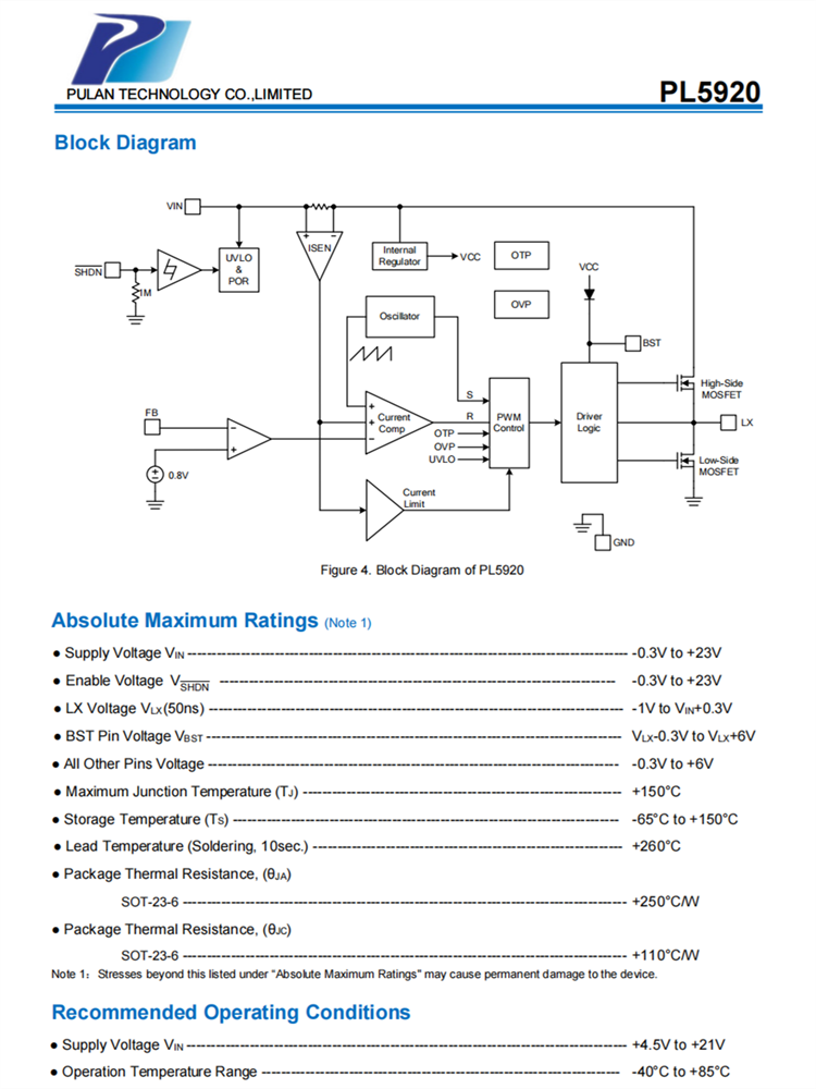 PL5920故障保護包括逐循環電流限制、UVLO、輸出過電壓保護和熱停機。可調軟啟動功能防止開啟時涌電流。該裝置采用電流模式控制方案,提供快速的瞬態響應。內部補償功能減少了外部補償組件,簡化了設計過程。在關機模式下,電源電流小于1μA。