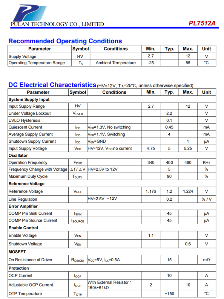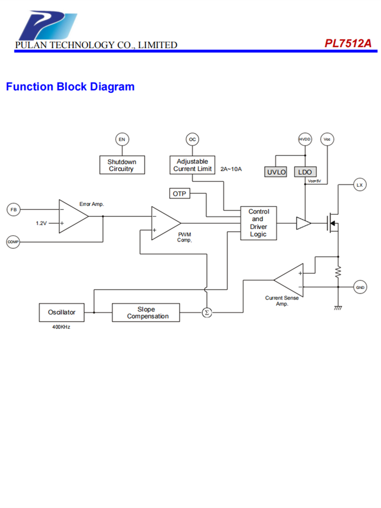 PL7512A是一個電流模式升壓DC-DC轉換器。它是PWM電路與內置的15mΩ功率MOSFET,使該調節器的高功率效率。誤差放大器的非反相輸入連接到一個1.2V的精度參考電壓。電流模式控制和外部補償網絡使系統穩定簡單靈活。