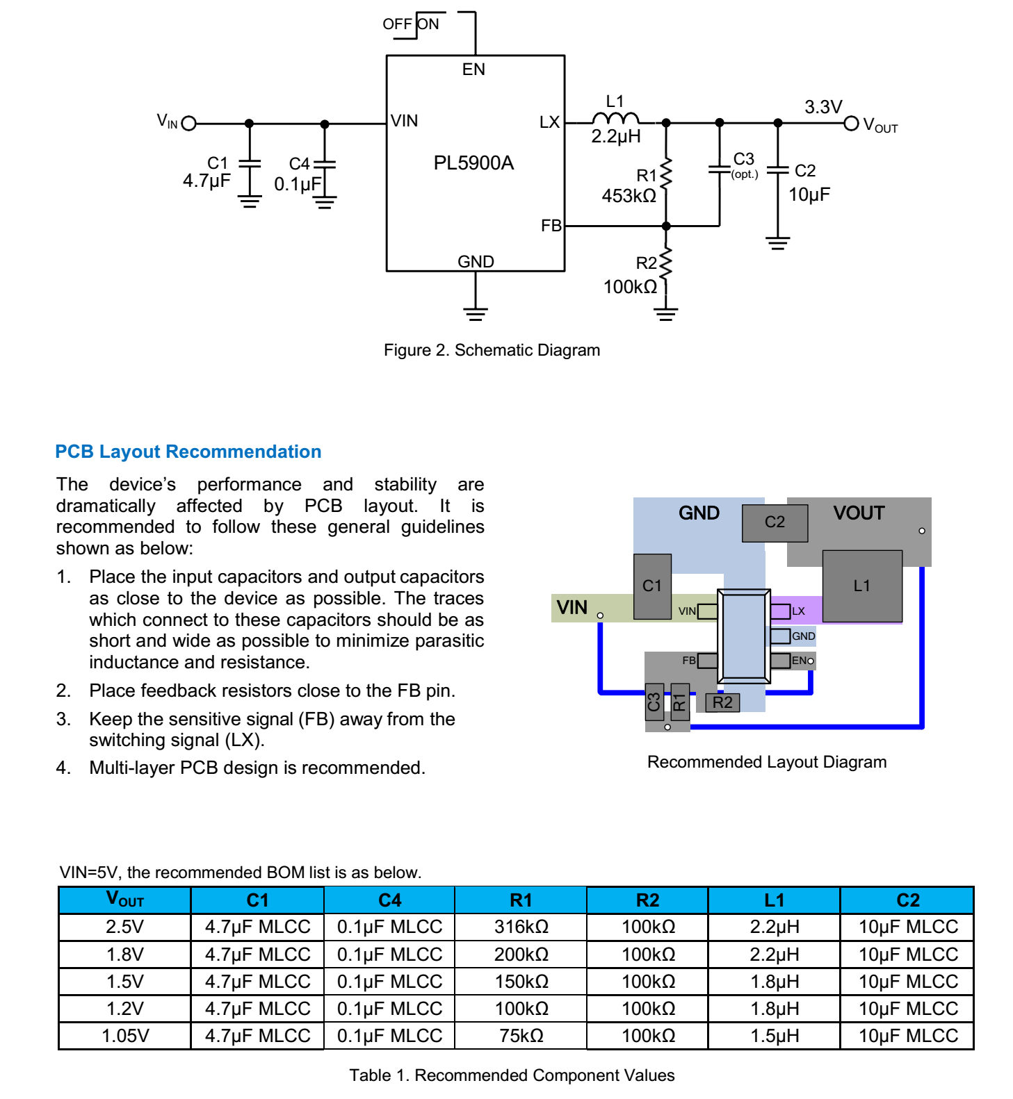 PL5900A開關頻率內(nèi)部設置為 1.5MHz, 允許使用小的表面安裝電感和電容器。