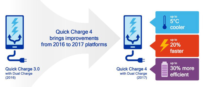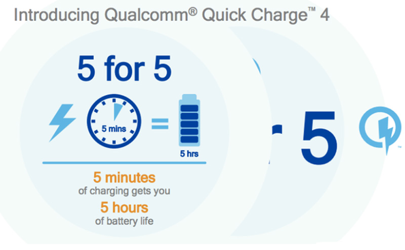 2016年11月17日,高通剛剛在紐約的驍龍技術峰會上髮佈瞭新一代的快充技術QC4.0。高通認爲,快充已經成爲瞭影響用戶購買設備的重要因素之一,高通最新的QC4.0快充技術,能夠給用戶帶來讓人滿意的快速充電體驗。高通用“5 FOR 5”來形容QC4.0,這項技術能在充電5分鐘的的情況下,讓用戶使用5箇小時(電池容量:2750mAh),牠可以在15分鐘內,將一箇電池容量爲2750mAh的設備充至50%的電量。QC4.0曏下兼容以往的QC3.0/QC2.0快充,支持USB Type-C、USB PD。
