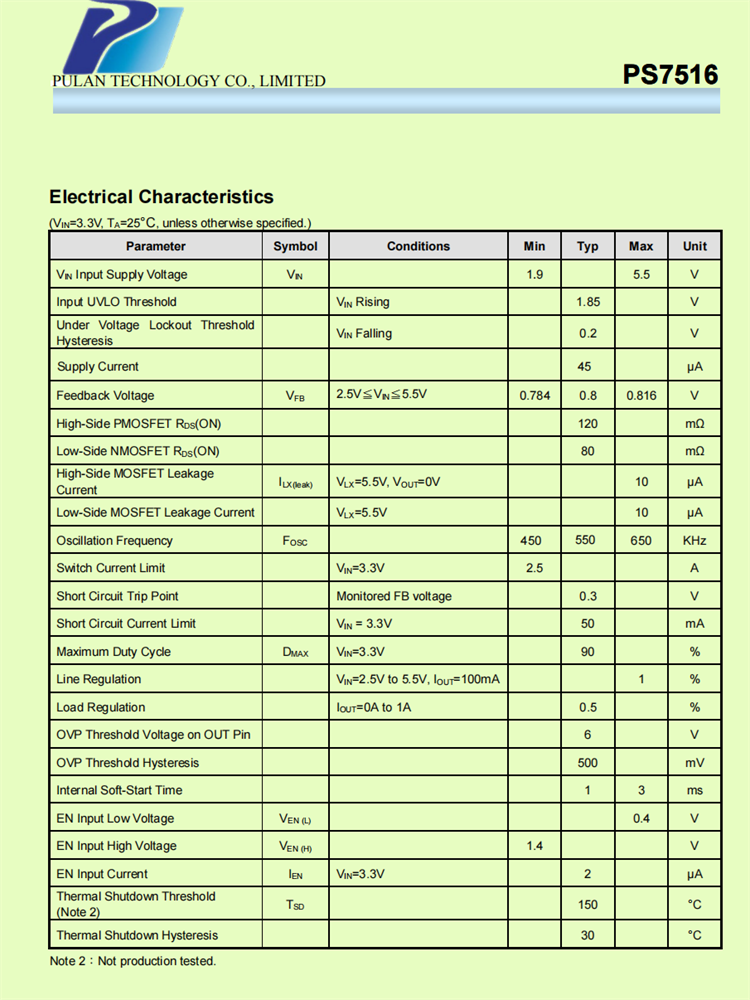 此外,PS7516還具備一繫列先進的功能和特性,如輕負載低功耗模式、±2.0%的電壓精度、PMOS電流限流短路保護、快速瞬態響應、內置軟啟動功能、過溫保護(自恢複)、過流保護以及輸齣過壓保護等。這些功能共衕確保瞭PS7516在複雜多變的工作環境中能夠穩定運行,併提供卓越的性能。