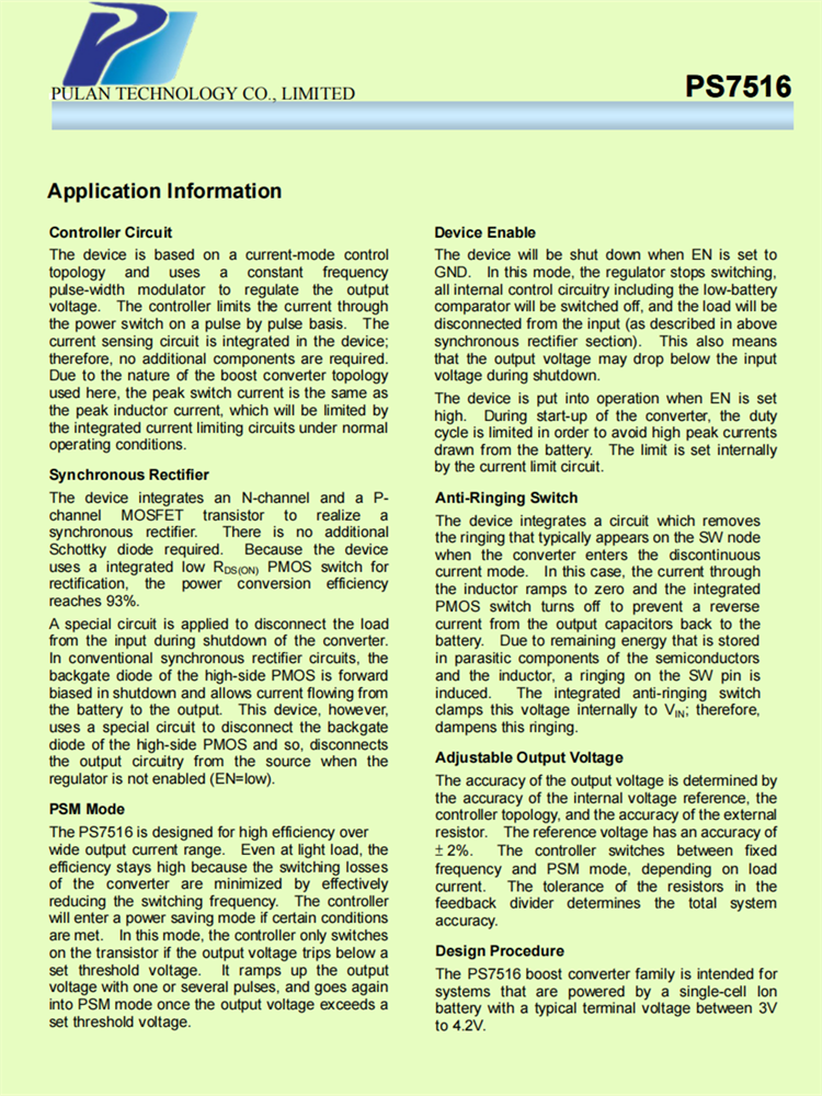 綜上所述,PS7516是一箇性能卓越、功能豐富且易於集成的陞壓DC-DC轉換器,非常適閤應用於移動電源、無線設備、手持式儀器和GPS接收器等領域。牠的高效、穩定和可靠性能將爲用戶帶來極佳的使用體驗。